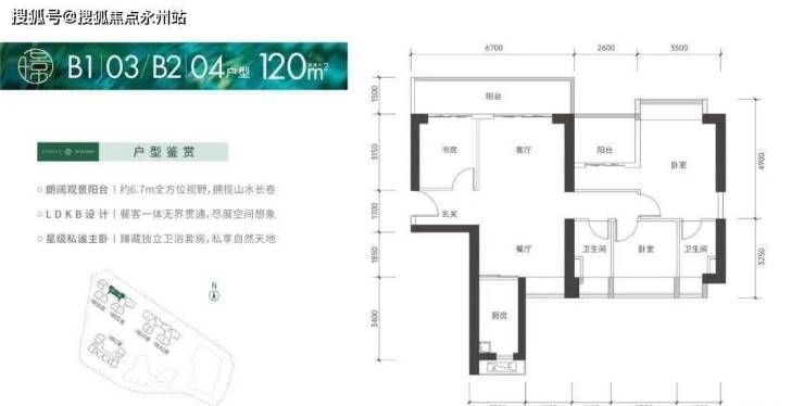 120㎡的4房2厅2卫,设计的是竖厅南北通透格局,客厅4.2米开间,进门入户玄关,LDKB一体化设计,4个卧室分别做到了3.5米/2.7米/2.6米/2.5米的宽度,客厅连接次卧出6.7米长的大阳台,L型厨房,卫生间干湿分离,得房率:75.66%(不含赠送),阳台主朝东北向。