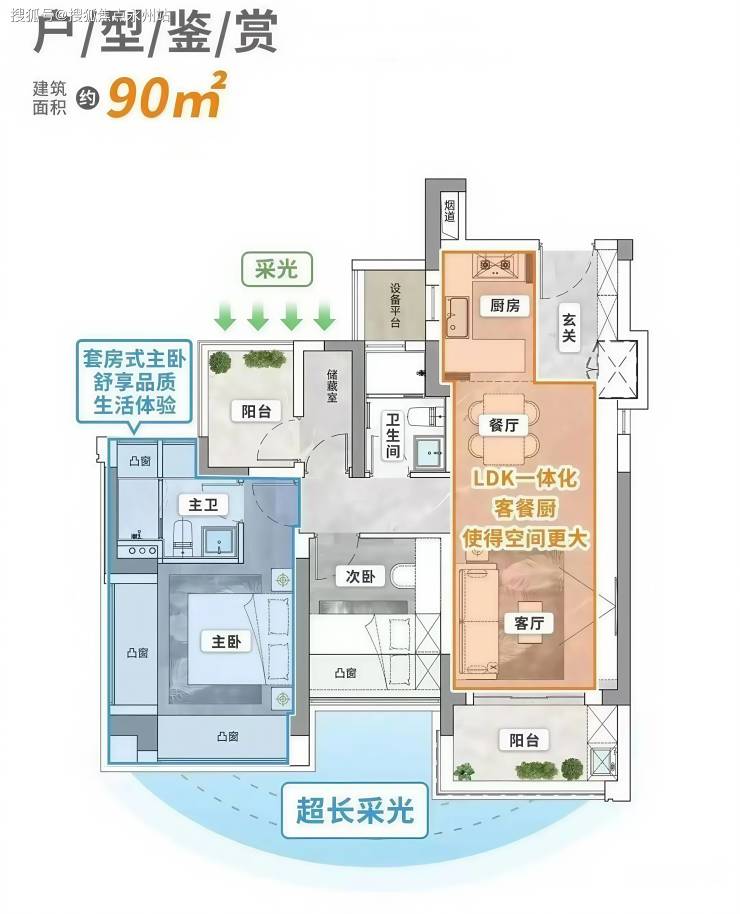 核心布局:LDKB 一体化设计,四开间朝南,客厅连接次卧出巨幕阳台(约 7.6 米),双主卧套房设计(含独立卫浴和衣帽间),U 型厨房带家政阳台。
