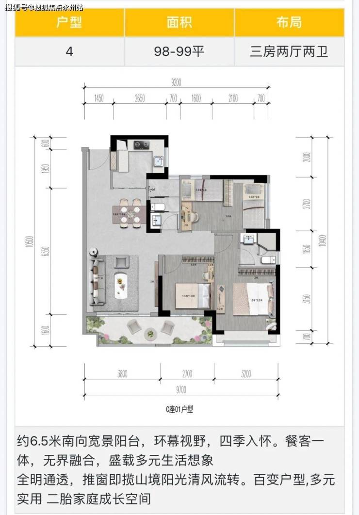 98-99㎡的3房2厅2卫,设计的是竖厅格局,客厅3.8米开间,LDKB一体化设计,三开间朝南,3个卧室分别做到了3.2米/2.7米/2.7米的宽度,其中1个次卧可以做多1个房中房,客厅连接次卧出6.5米长的大阳台,U型厨房,卫生间干湿分离,得房率约90%(包含赠送),东南朝向。