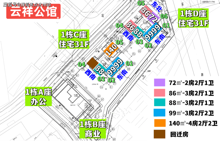 总规划317户,其中可售商品房172套,保障性住房44套,回迁房101套,2梯5户/2梯6户的设计,地下室有3层,规划停车位610个,其中带充电桩车位183个,其它有预留充电设施安装条件。