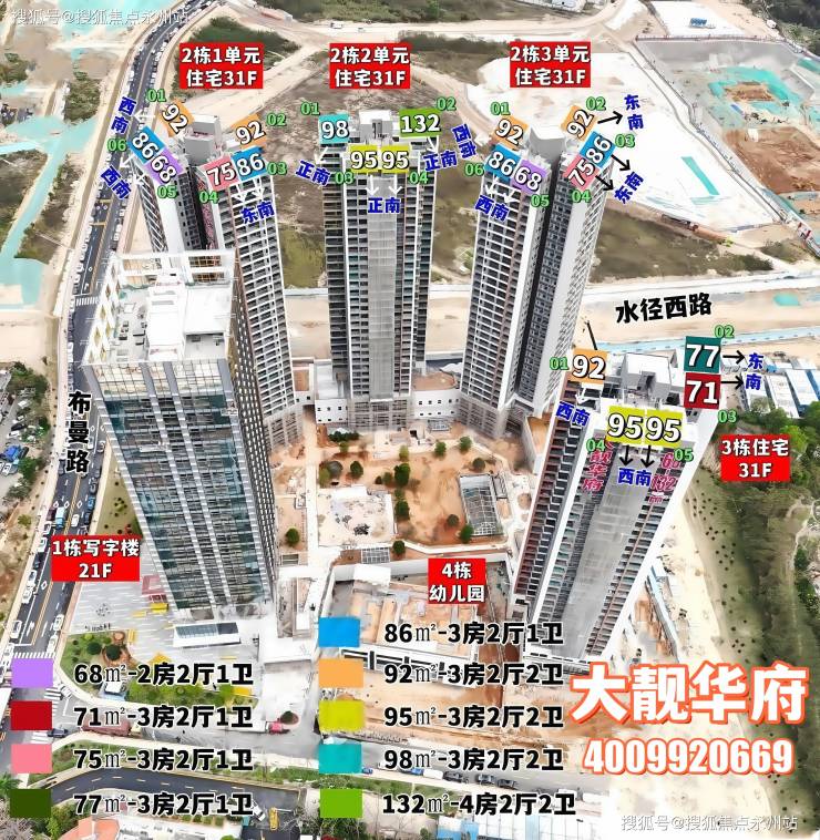 楼栋分布:4 栋 31 层住宅 + 1 栋 21 层写字楼 + 1 所幼儿园