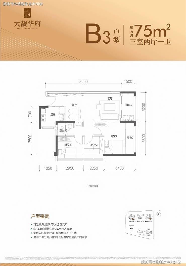 77㎡3房2厅1卫东南向:得房率88.31%,主卧面积(含飘窗)11.3㎡双次卧均带飘窗、竖厅设计。