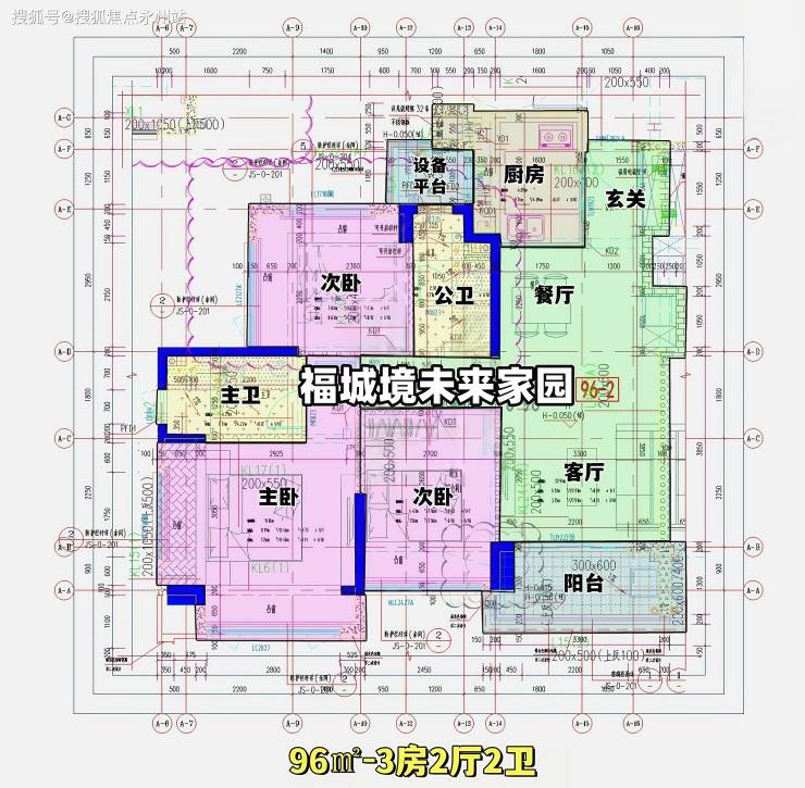 96㎡的3房2厅2卫(-1),设计的是经典竖厅格局,进门入户玄关,客厅3.7米开间,LDKB一体化,S墙设计预留冰箱卡槽位,动静分区,三开间朝南,3个卧室分别做到了主卧14.13㎡/次卧9.91㎡/次卧9.45㎡(去掉墙体,包含飘窗),U型厨房,公卫三段式分离,还带1个设备平台,东南朝向。