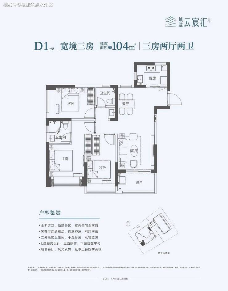 104㎡ 三房两厅两卫:竖厅南北通透格局,三开间朝南,U型厨房,动静分离。朝向:东南向阳台,客厅面宽3.2米。