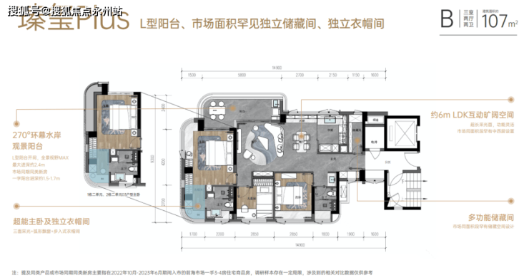 ◉书房270°环幕转角景观书房,市场罕见。◉儿童房灵动空间设计,可改为多类型空间使用,满足三口、四口等不同阶段的家庭需求,陪伴家庭全周期成长。◉主卧南北通透布局,享受 270°环幕河景。利用飘窗设置 L型转角步入式衣帽间,尽头处还有超视野化妆空间。