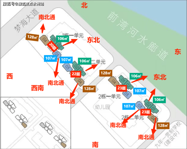 每个面积段的户型,在四栋楼中都有分布,其中景观面最好的是106平的01/02户型,正看一线河景,未来无遮挡