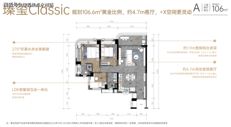 ◉客餐厅南北通透、超大面宽、采光通风好。横厅格局设计,客餐厨一体化,开间进深达到豪宅的开间尺度,可看河景。