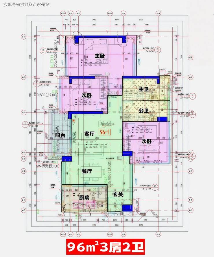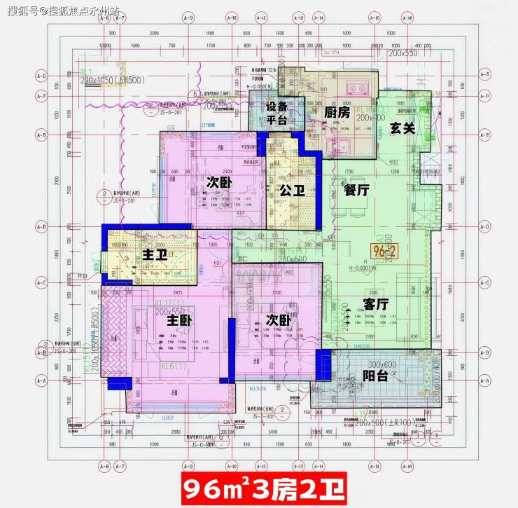 96㎡的3房2厅2卫(1),设计的是经典竖厅格局,进门入户玄关,客厅3.7米开间,LDKB一体化,S墙设计预留冰箱卡槽位,动静分区