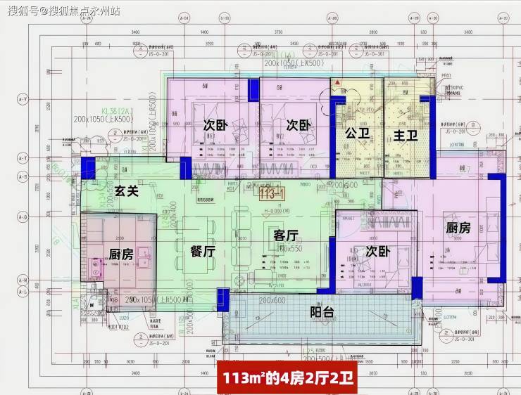 113㎡的4房2厅2卫,设计的是横厅南北通透格局,独门独户,进门入户玄关,客餐厅6.2米开间,LDKB一体化