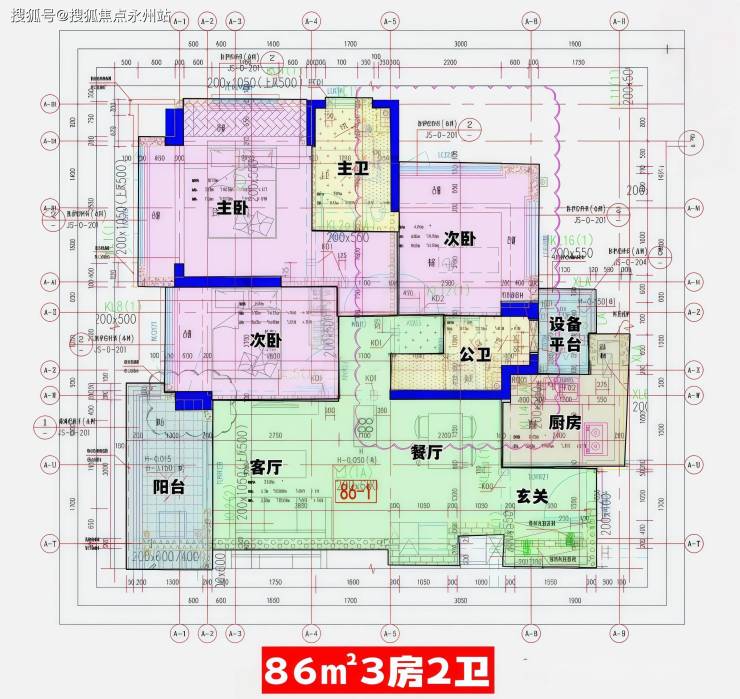 86㎡的3房2厅2卫,设计的是经典竖厅格局,进门入户玄关,客厅3.4米开间,LDKB一体化,S墙设计预留冰箱卡槽位,动静分区,