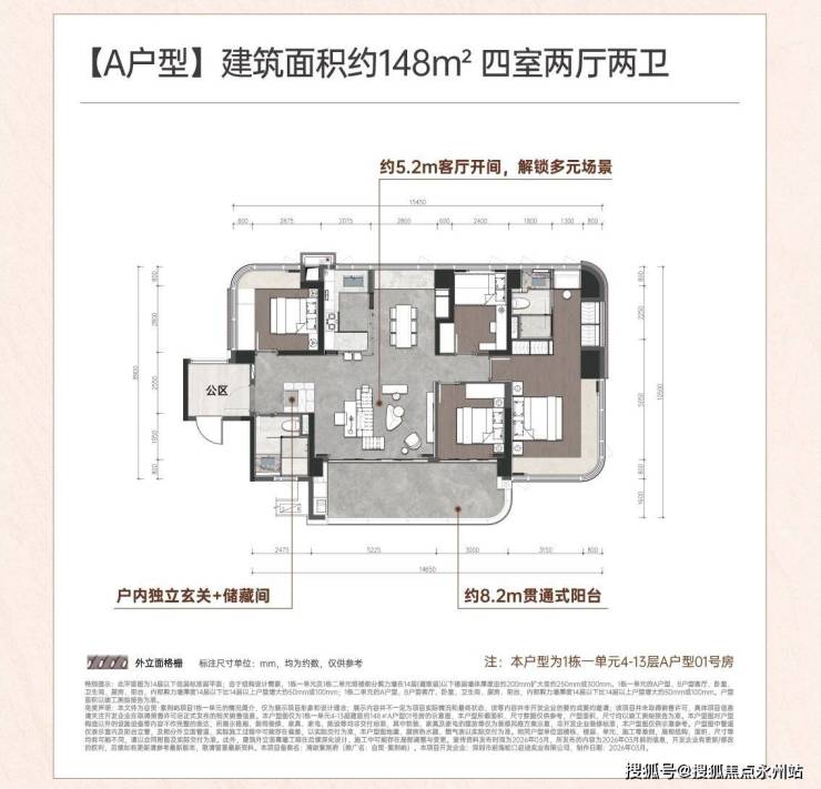 项目最大的卖点之一就是其"新规"户型设计,摒弃了刚需小户型,主打建面约108-148㎡的3-4房纯改善产品,所有户型均为东南或西南朝向,楼栋采用错位排布设计,最大化释放视野与采光面,实现"一户一景"。部分户型配备270°弧形飘窗,主卧套间+双龙抱珠格局提升私密性。