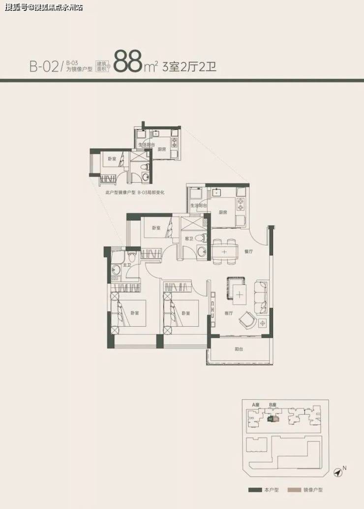 88㎡3房2卫(户型02.03) 58套