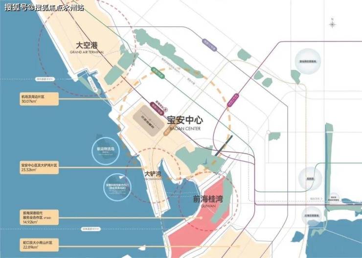 区域总规划面积95平方公里,相当于6个前海。它包含了空港新城、宝安机场、海上田园、机场码头、综合港区等重大项目,由于客流、物流、信息流集中,机场周边将逐步成为一个临空经济圈。