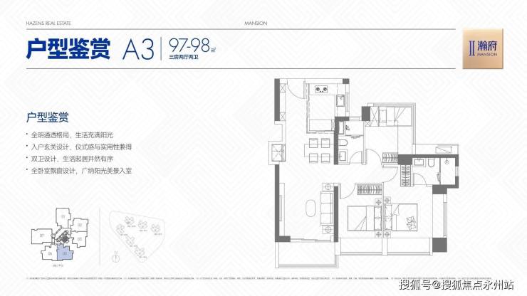 【建筑面积96-98㎡3房2卫】03/05/06(A2/A3)户型,竖厅三开间朝南格局,客厅3.5米开间,LDKB一体化,S墙设计预留冰箱卡槽位,主卧+1个次卧双飘窗。得房率约78%(不含赠送)