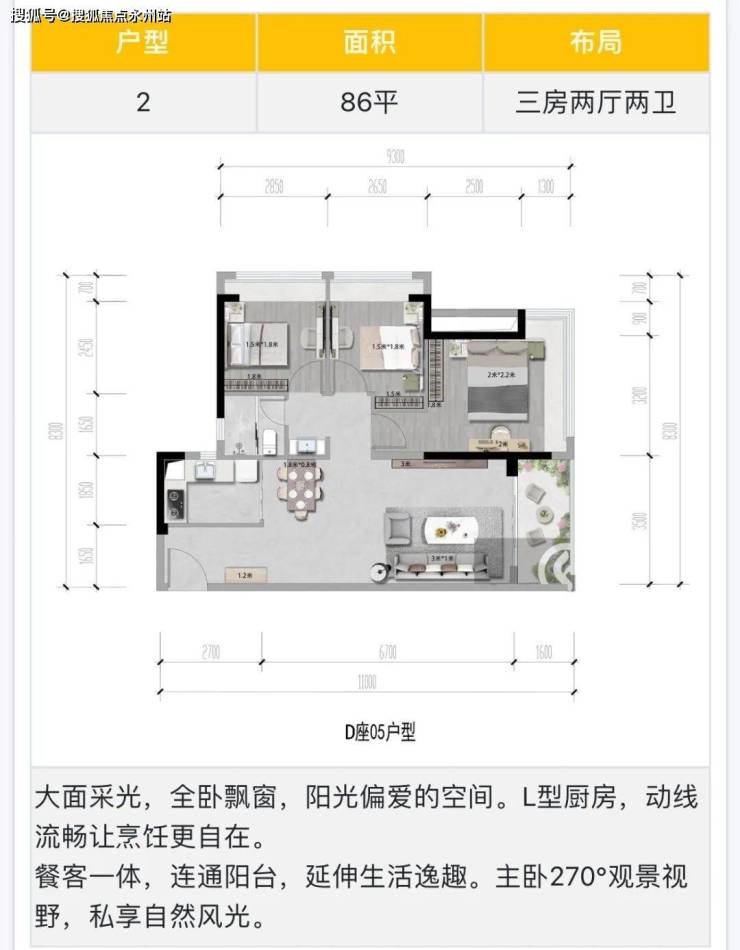 86㎡的3房2厅1卫,设计的是竖厅格局,客厅3.5米开间,LDKB一体化设计,3个卧室分别做到了3.2米/2.85米/2.65米的宽度,L型厨房,卫生间干湿分离,得房率约90%(包含赠送),东北或西南朝向