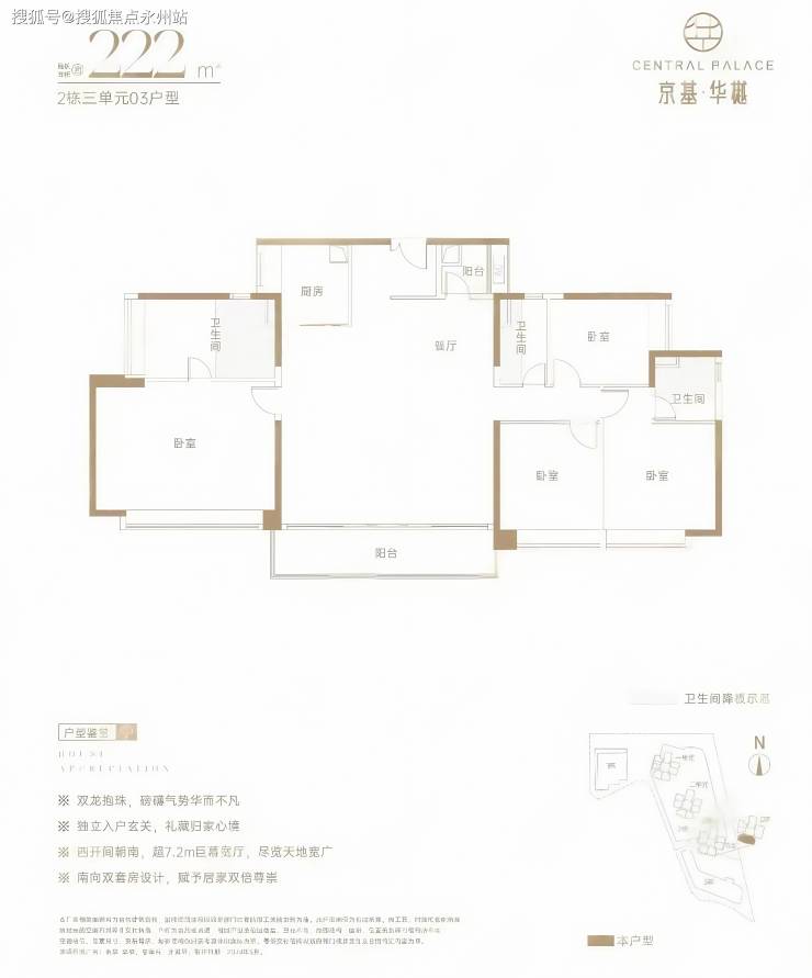 222㎡的4房2厅3卫,设计的是竖厅双龙抱珠格局,客厅7.2米开间,四开间朝南,主卧大套间设计,U型厨房,餐厅位还带1个小生活阳台,卫生间干湿分离,得房率约73%(不含赠送),阳台朝西南向。