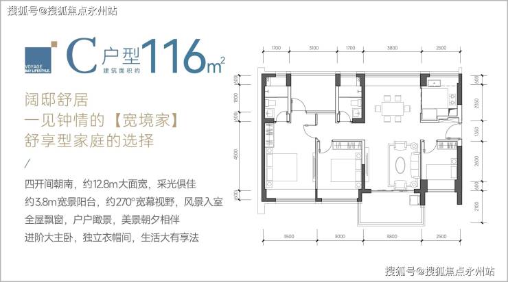 设计亮点:四开间朝南:客厅开间3.8米,南北通透,主卧17.85㎡(含飘窗),次卧 11.4㎡、9.3㎡、8㎡,均为全明设计。