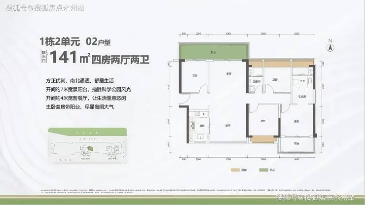 141㎡的4房2厅2卫,1栋2单元02户型,设计的是竖厅南北通透格局,进门入户玄关,客厅4米开间,餐客分离,餐厨一体设计,四开间朝南,主卧套房带阳台,客厅连接次卧出7米长的巨幕大阳台,U型厨房,卫生间干湿分离,阳台主朝东北向看科学公园。