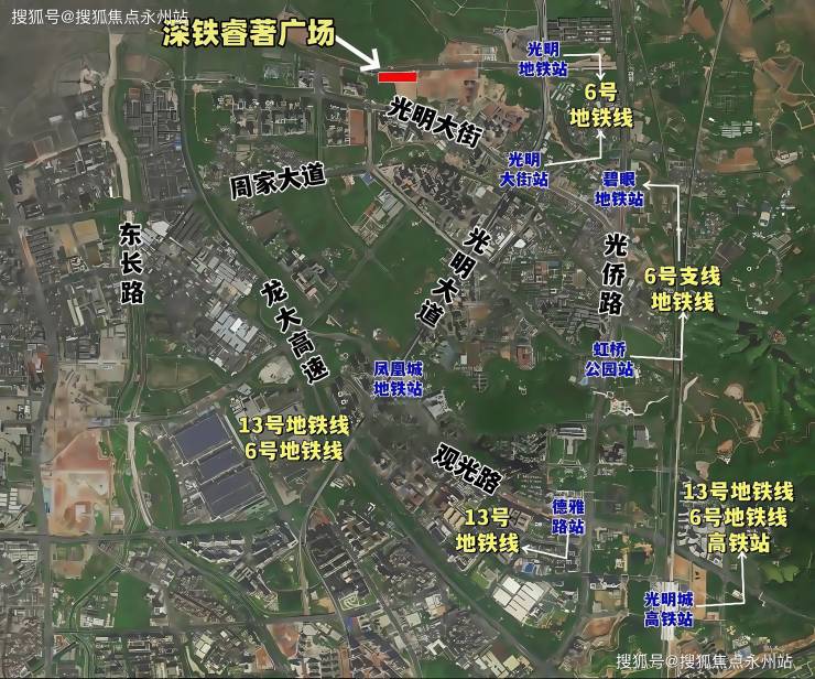 深铁睿著广场位于光明区新湖街道楼村社区,光明中心区科学公园板块,光辉大道与华夏路交汇处东南角。距离6号线光明站步行约1.1公里,距离6号线楼村站步行约1.3公里。