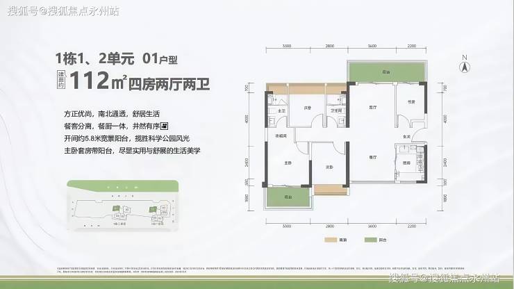 112㎡的4房2厅2卫,1栋1/2单元01户型,设计的是竖厅南北通透格局,进门入户玄关,客厅3.6米开间,餐客分离,餐厨一体设计,四开间朝南,主卧套房带阳台,客厅连接次卧出5.8米长的巨幕大阳台,U型厨房,卫生间干湿分离,阳台主朝东北向看科学公园。