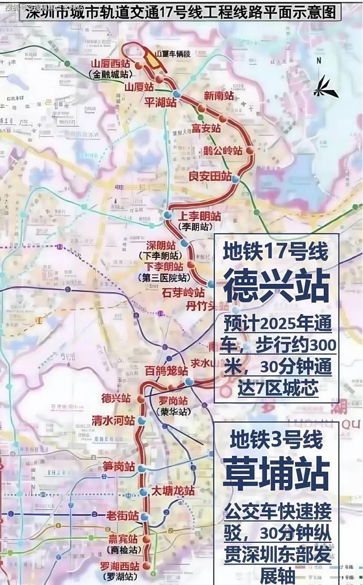 17号线(规划中)“德兴站” 4站到老街,6站就到罗湖口岸。另外到清水河站可换乘已经动工在建的14号线,2站可到福田岗厦。(规划来源:深圳市规划和自然资源局)