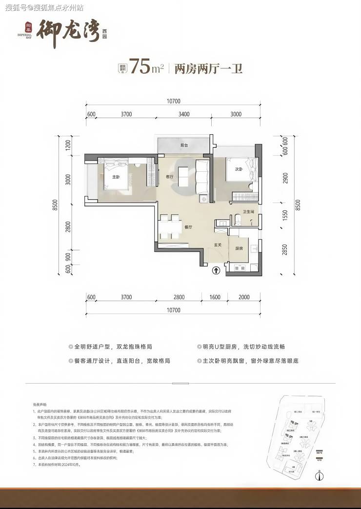 75㎡2房1卫,分布在1栋3/4单元03/06户型,设计的是竖厅稀缺的双龙抱珠格局,客厅开间3.4米,U型厨房,卫生间三段式分离设计,得房率约73.26%(不含赠送),东南或西北朝向,加上赠送得房率约80%。