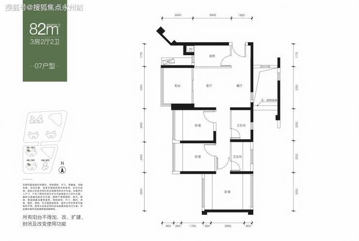 82㎡的3房2厅2卫户型设计的是竖厅南北通透格局,客厅3.3米开间,3个卧室分别是3米/2.6米/2.4米的宽度,主卧南北通透设计,L型厨房。