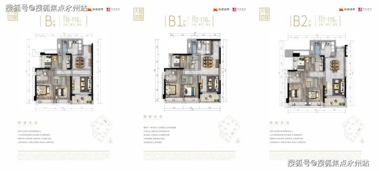 B栋56层4梯6户,01、03、04、06是116-119㎡三房;02和05是103-106㎡三房