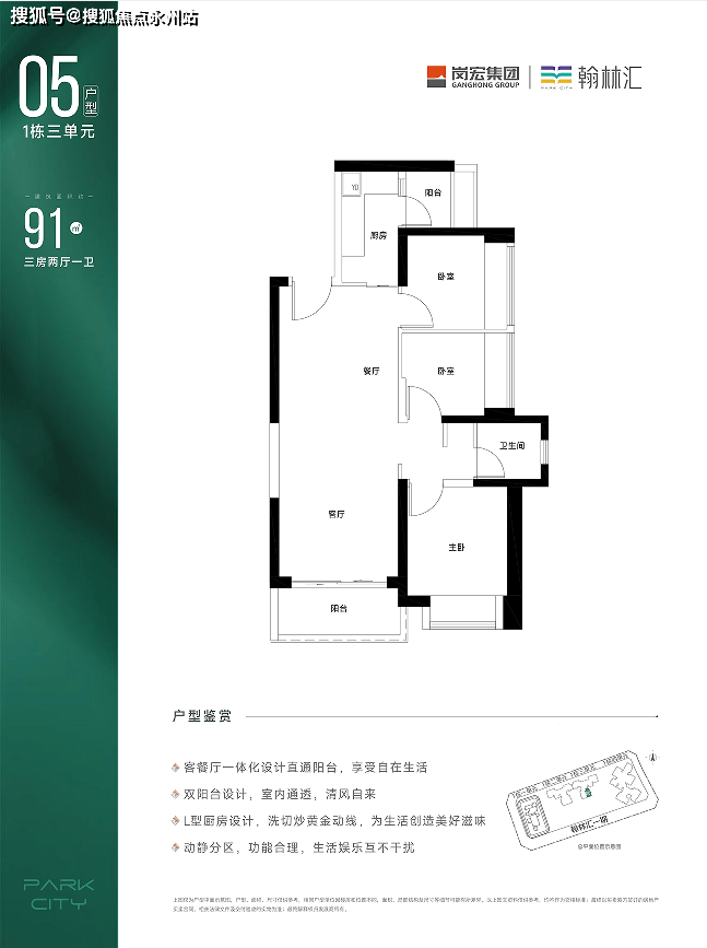 91㎡雅致三房:独立玄关设计,南向采光,通透明亮。