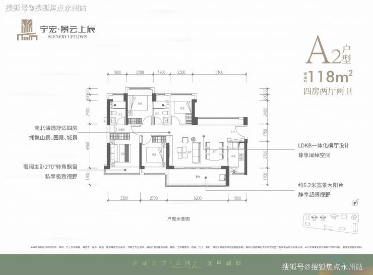 格局设计:横厅南北通透,五开间朝南,客餐厅6.2米开间,全景落地窗设计。