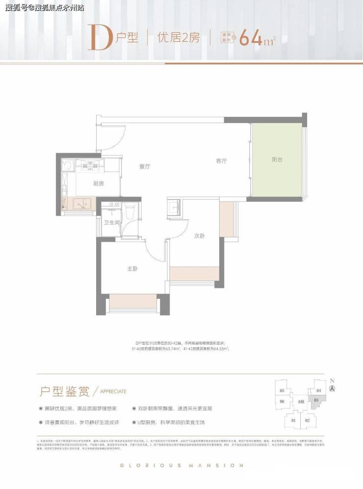 64㎡两房两厅一卫:设计的是竖厅格局,LDKB一体化,双卧室朝南向,次卧双飘窗设计,U型厨房,卫生间干湿分离,阳台朝正西向。