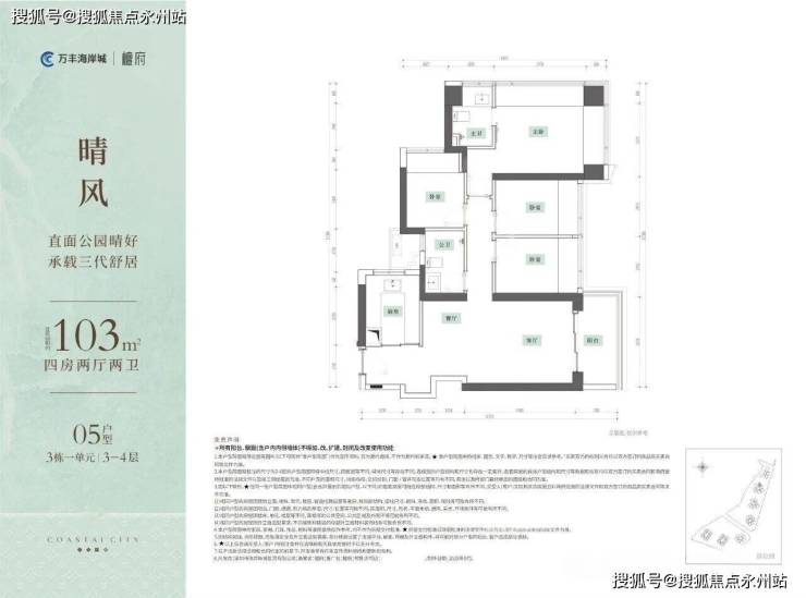 103㎡竖厅四房:传统布局,北向次卧可改书房,适合三代同堂家庭,东南或西南朝向,约10米采光面,折后总价约556-662万。
