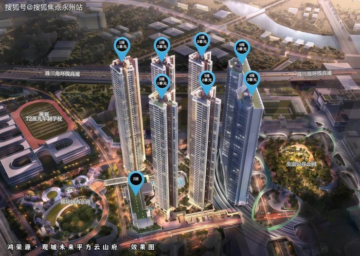 『鸿荣源·观城未来平方云山府』地块有5栋住宅楼,均为可售商品房,总高58-59层,4层+以上是住户层,标准层层高2.9米,12-26-43层是避难层,避难层层高是3.15米,均为4梯6户,总共1556套房。