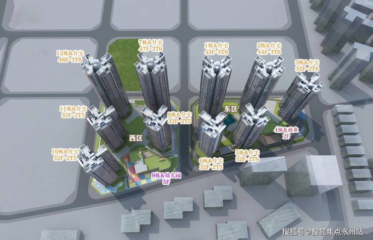 西区:6座建筑,其中5座32-47层住宅+1所幼儿园,共976户。配1096辆车位,住宅标准层高3米,有2T5、3T6户两种梯户比。