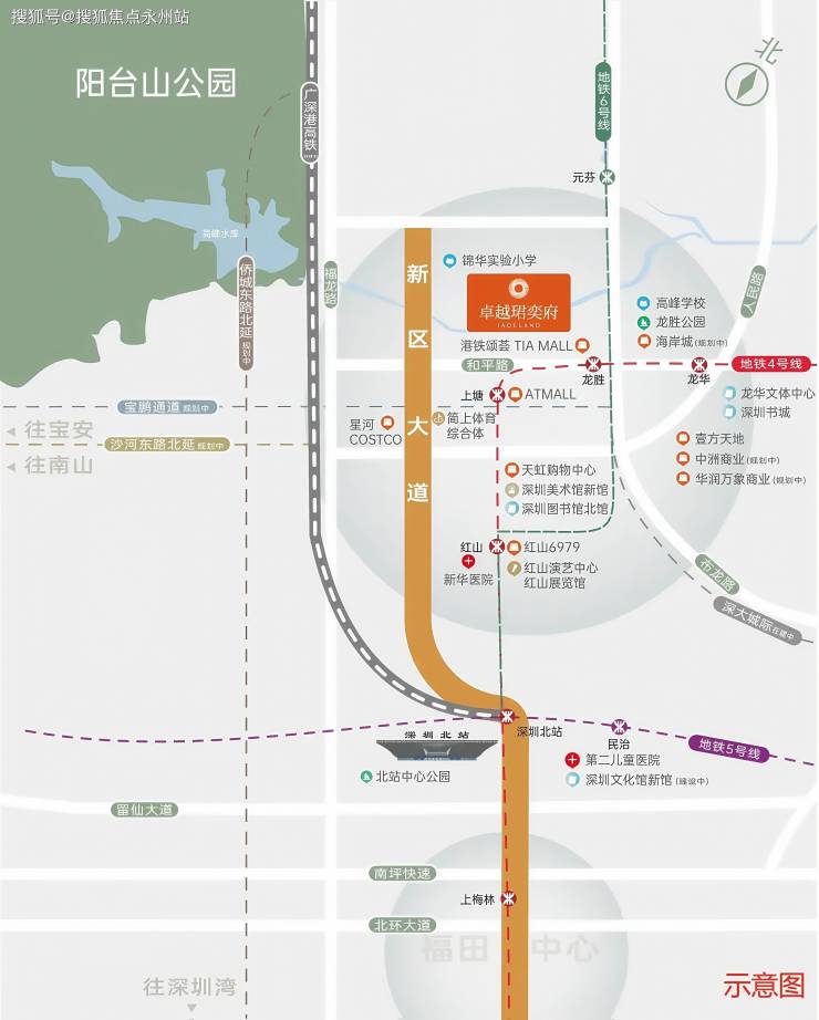 交通出行:双地铁环绕:距 4 号线龙胜站约 500 米,6 号线元芬站约 800 米,3 站直抵深圳北站,5 站速达福田,深大城际(在建)龙胜站规划中,未来 3 站宝安机场。