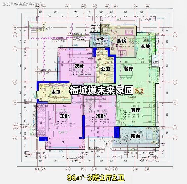 96㎡的3房2厅2卫(-1),设计的是经典竖厅格局,进门入户玄关,客厅3.7米开间,LDKB一体化,S墙设计预留冰箱卡槽位,动静分区,三开间朝南,3个卧室分别做到了主卧14.13㎡/次卧9.91㎡/次卧9.45㎡(去掉墙体,包含飘窗),U型厨房,公卫三段式分离,还带1个设备平台,东南朝向。