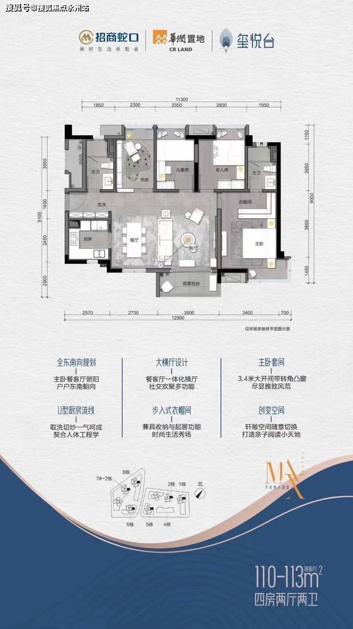玺悦台建面约95-113㎡三至四房,满足育龄、三代同堂等家庭空间需求,美好生活一步到位;约80%高得房率,户型格局方正,朝向采光俱佳,人性化设计厨房,阔景大阳台,主卧套房L字形凸窗设计等。