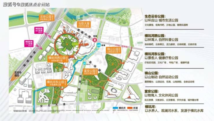 项目特点:除了常规的住宅、商业、学校外,还包含文旅、医疗、公园等,另外打造特色连廊串联整个项目,高速直通地库优化交通。