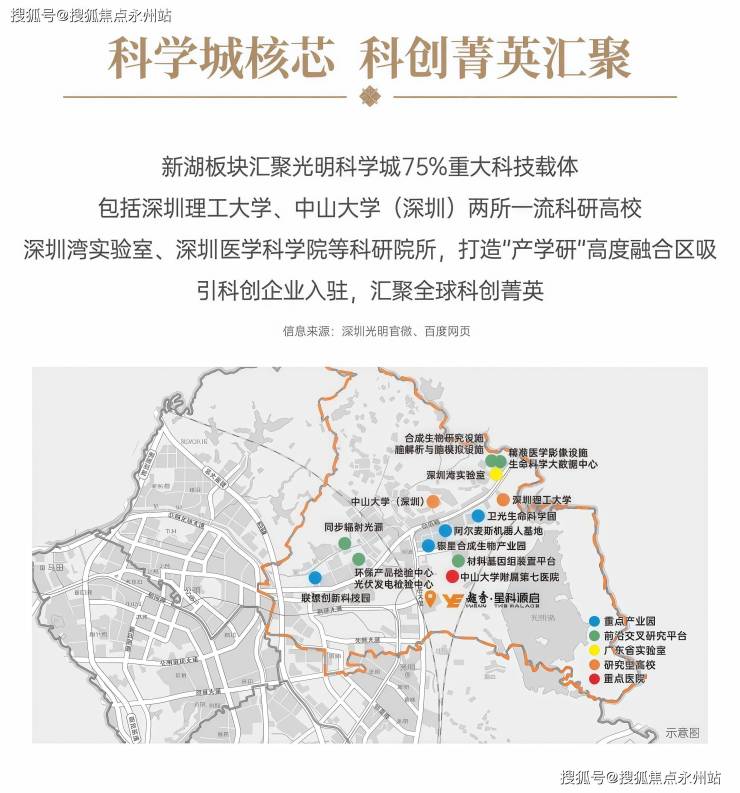 科学城核芯 科创菁英汇聚:新湖板块汇聚光明科学城75%重大科技载体,包括深圳理工大学、中山大学(深圳)两所一流科研高校,深圳湾实验室、深圳医学科学院等科研院所,打造“产学研”高度融合区,吸引科创企业入驻,汇聚全球科创菁英