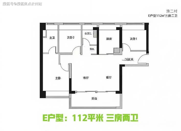 E户型112平米 三房两卫:独立玄关入户,餐客厅一体,主卧套房设计,客卫干湿分离,阳台宽敞,全屋多飘窗,阳台宽敞,总体来说户型不错。
