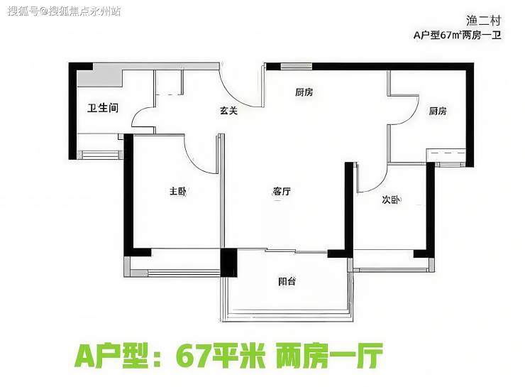 A户型67平米 两房一卫:双龙抱珠的户型,客厅出阳台,餐厅位置不太好放餐桌。