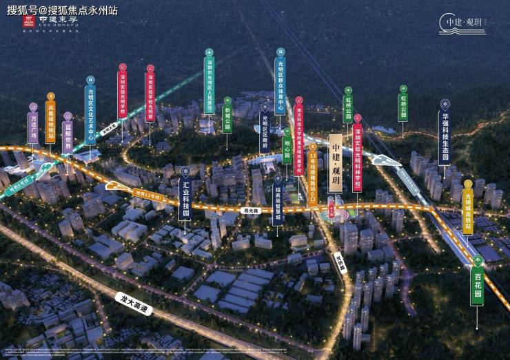 中建观玥名邸,位于光明区凤凰街道光侨路与观光路交汇处东南侧,地处光明科学城核心区与凤凰城板块交汇处,是光明高铁站板块最后一块住宅用地。作为光明科学城"一心两区"战略布局中的关键节点。