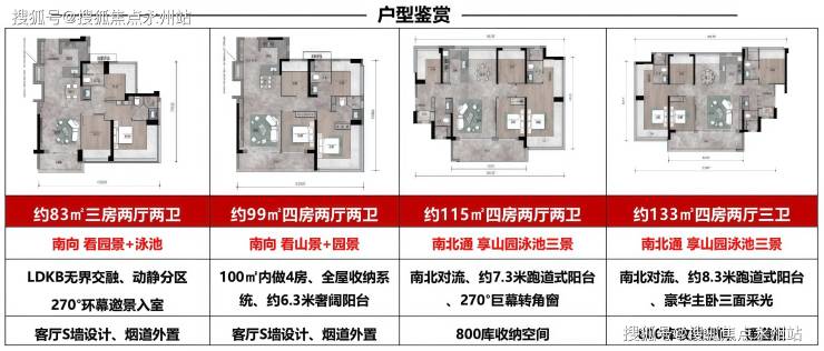 115-133㎡四房两厅两卫/三卫:南北通透,7.3-8.2米超大景观阳台,折后总价约 439-523万。