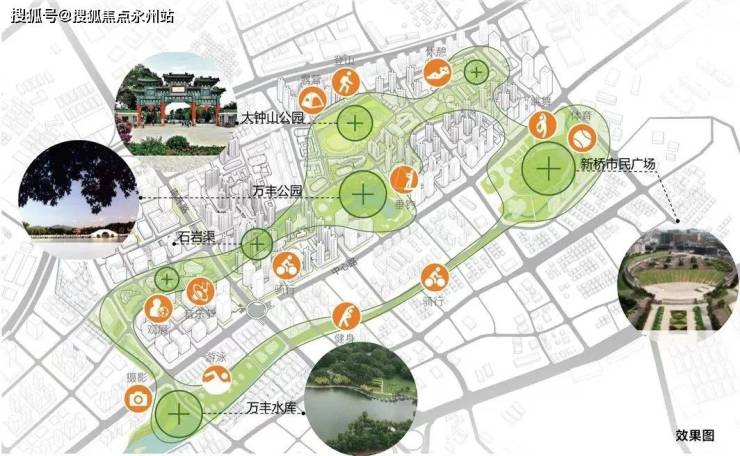 万丰项目并不满足于脚下,更是串联起城市公共空间及生态绿地,以新桥市民广场、大钟山,石岩渠、万丰水库和立新水库等绿色生态资源为基础搭建”生态绿环+城市绿芯”生态色框架,打造“线性公园”+“节点公园”公共开放空间体系,形成10公里生态绿环创造了片区居民多样化的居住休憩生活方式,打造万丰十公里生态绿谷。