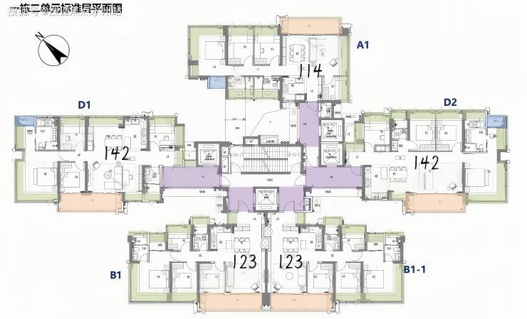 143㎡的4房2厅2卫,南北通透看海景,D2户型,设计的是横厅南北通透格局,独立专梯入户,送约12㎡的私用公区,客餐厅7.65米开间,LDKB一体化,四开间朝南,4个卧室分别做到了主卧27.8㎡/次卧11.4㎡/次卧11.2㎡次卧11㎡(包含墙体飘窗),客厅出5.8米长的瞰海大阳台,L型岛台式厨房,公卫三段式分离,套内面积111.54㎡+赠送30.47㎡(不含公区),加上得房率约99.3%。
