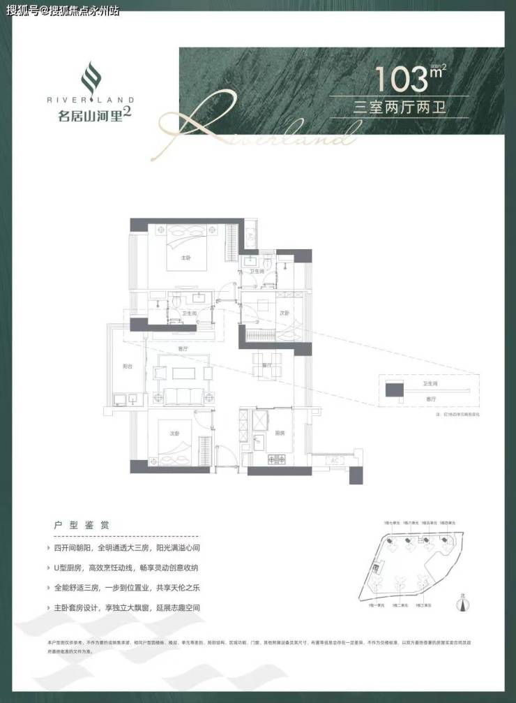 103㎡三室两厅两卫,设计的是竖厅南北通透格局,客厅3.4米开间,四开间朝南,全屋飘窗,U型厨房,得房率:73.04%(不含赠送),阳台1.6米进深,主朝西南向。