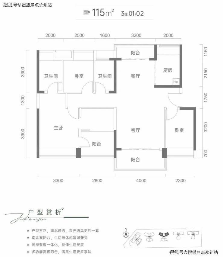 115平3+1房2卫:这个面积段是套数最多的,有四条腿、有两个户型。3栋两条腿对称,一个东南、一个西南朝向;4栋两条腿都是南北通透。这两个户型设计和布局都还不错,