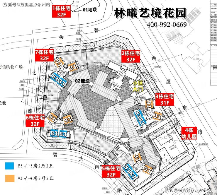 02地块:总占地面积约1.72万㎡,总建筑面积约9.85万㎡,计容建筑面积约6.77万㎡,容积率3.9,绿化率32.67%,共由5栋总高31-32层的住宅组成,其中2/5/6/7栋住宅32F,3栋住宅31F,4栋是1所幼儿园。总规划585户,2栋楼王2梯3户,其余栋数全部2梯4户设计,地下室有3层,规划有702个停车位,其中带充电桩车位211个,车位占比约1:1.2。
