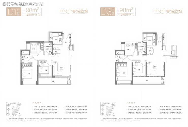 D3户型:布局与D1一致,但全部为东南朝向,采光更优,得房率80.12%(不含赠送)