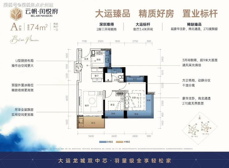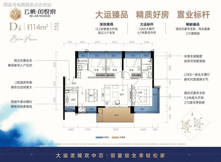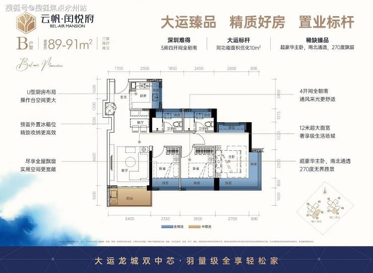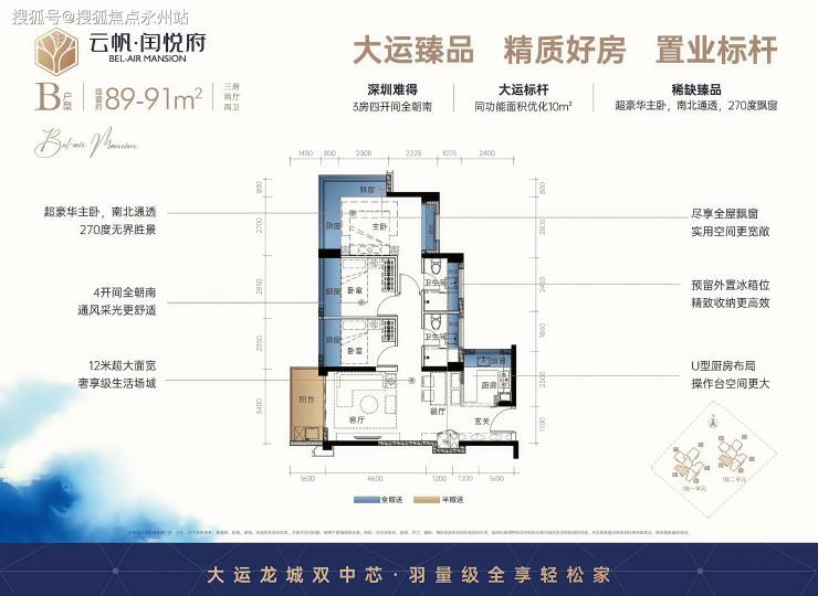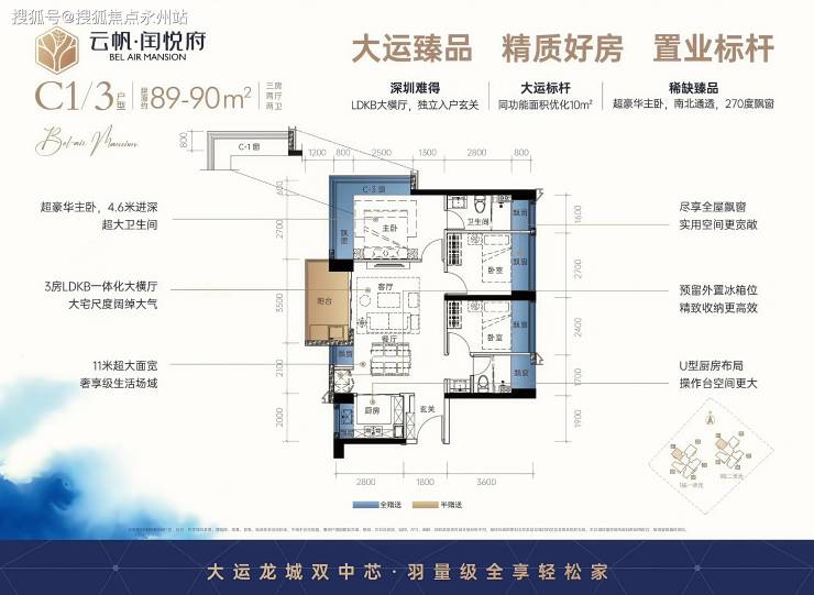 尺度升级:经典大横厅设计,LDKB 一体化开间 6.9 米,客厅带 5.2 米大阳台,主卧套房含衣帽间及独立卫浴,全屋飘窗数量达 9 个(卧室、厨房、卫生间均有)。